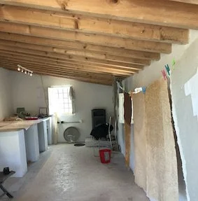Simon and Donna spent 2 to 3 years connecting a series of farm buildings to create studios, communal areas and residential spaces, resulting in an irregular, long rectangular building with thick walls and interesting chimney stacks.
